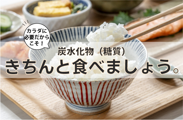 3大栄養素のひとつで、体を動かすエネルギーとして使われる、体にはなくてはならない栄養素。主食となる食品、ご飯やめん類、パン類、イモ類などに多く含まれます。